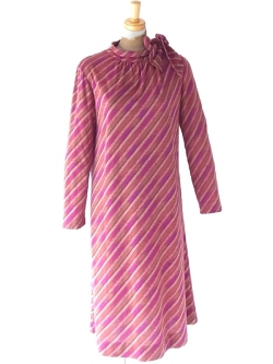 【送料無料】フランス買い付け 70年代製 パープル X ゴールド ストライプ 襟元リボン ヴィンテージ ワンピース 24FC411【ヨーロッパ古着】