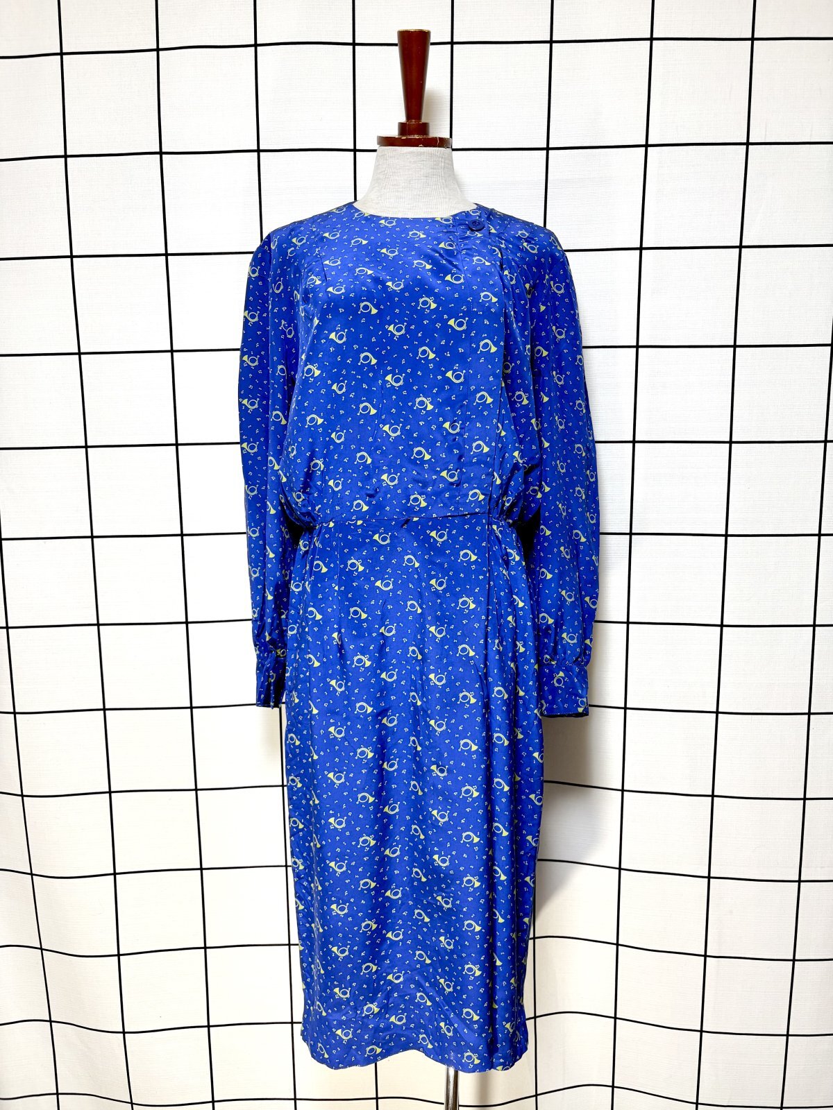 ラッパ柄 音符柄 ブルー ウエストゴム レトロ USA古着 ヴィンテージワンピース
