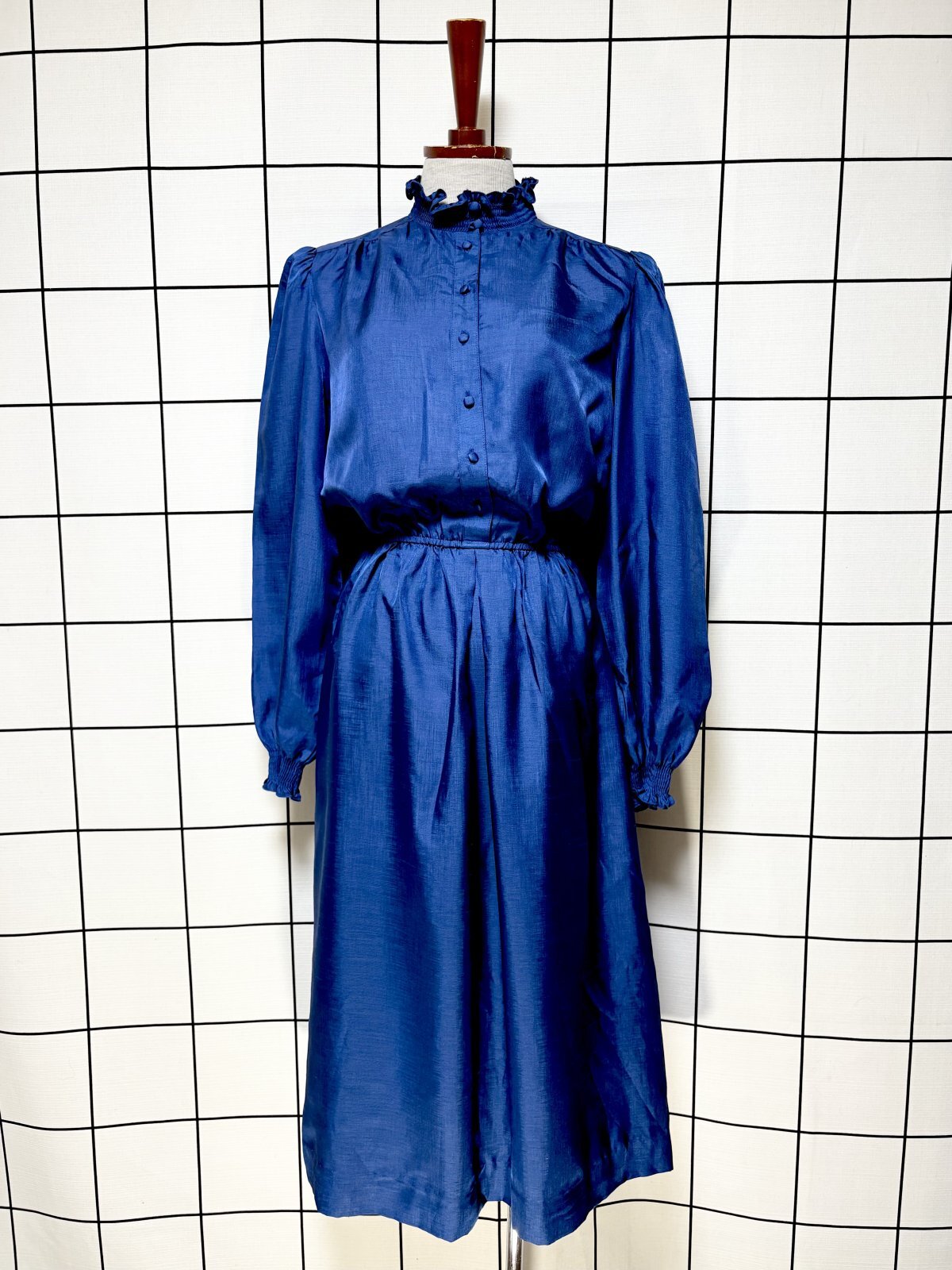 フリル装飾 無地 ネイビー ウエストゴム レトロ USA古着 ヴィンテージワンピース