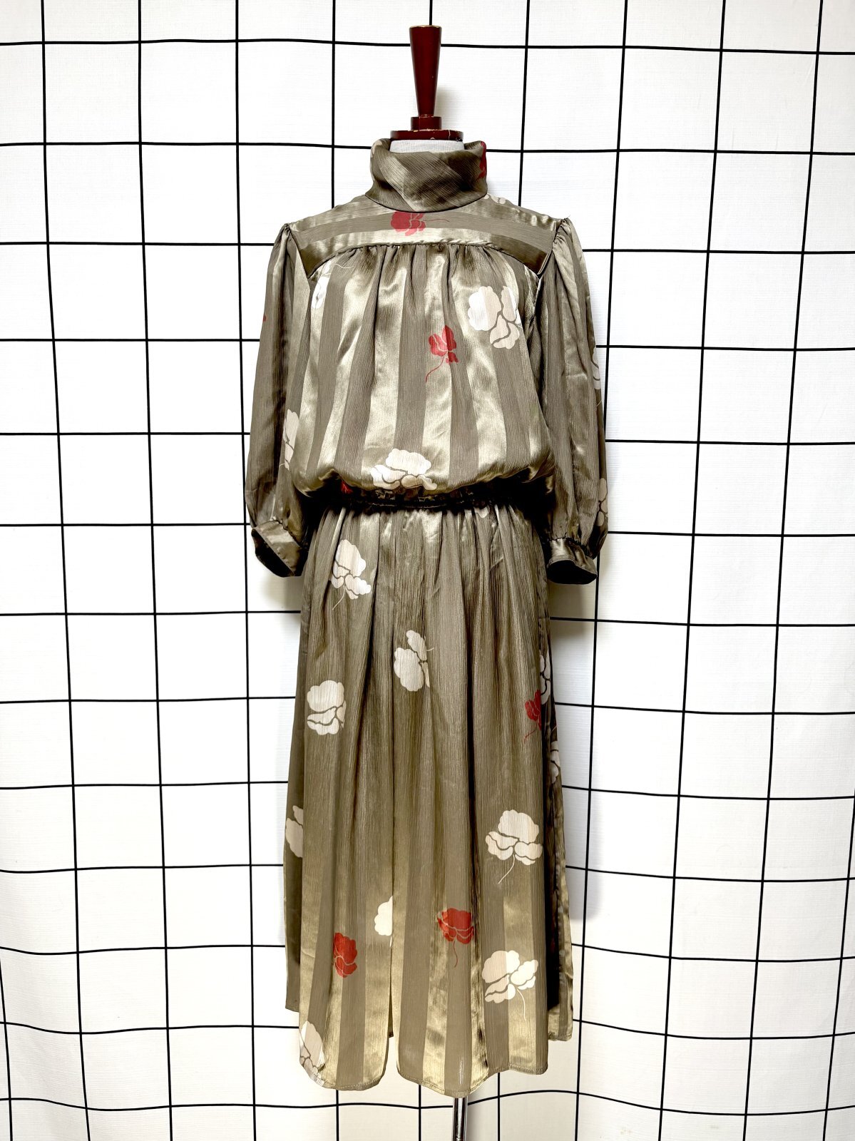 タートルネック ストライプ 花柄 UNIONMADE ウエストゴム レトロ USA古着 ヴィンテージワンピース