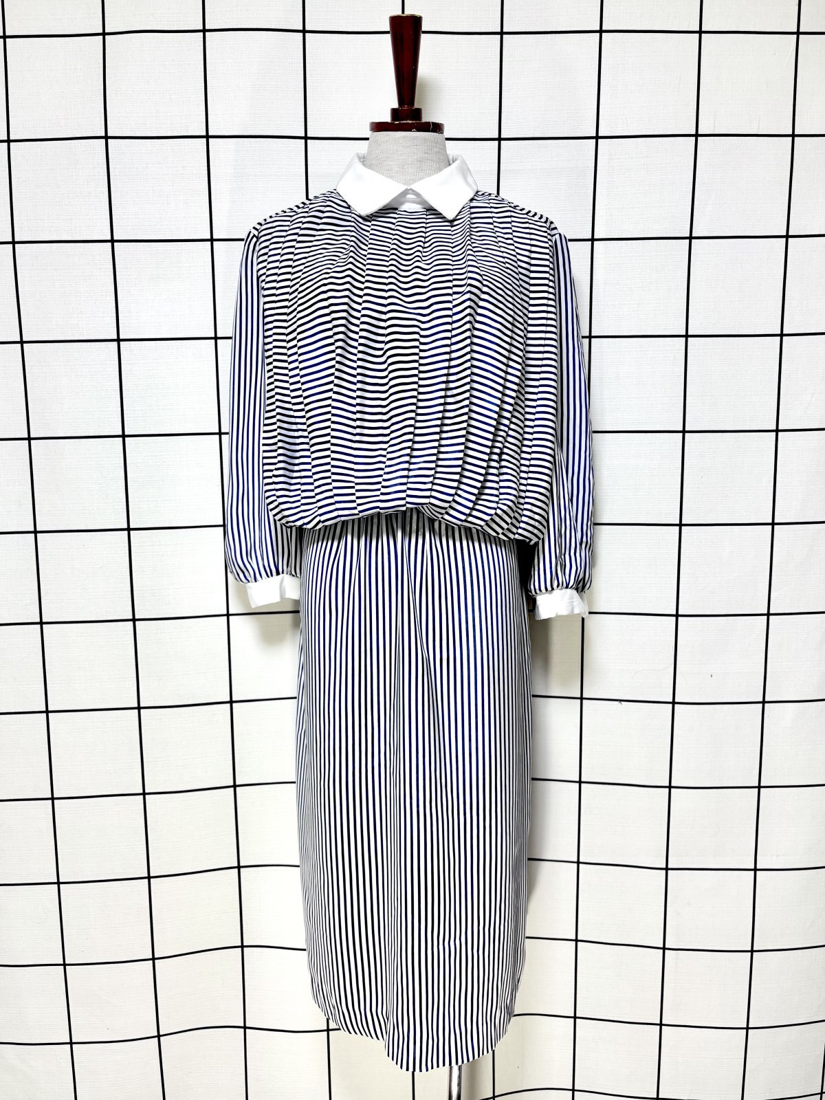 ストライプ ホワイト ネイビー ウエストゴム レトロ USA古着 ヴィンテージワンピース