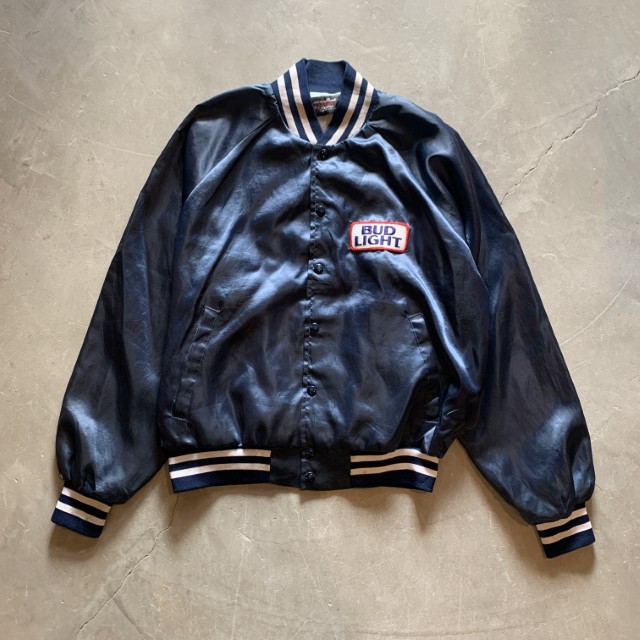 【L/XL】80s USA製 BUD LIGHT バドライト ビール ワッペン付き ナイロンジャケット ネイビー■ビンテージ アメリカ古着 企業 サテン