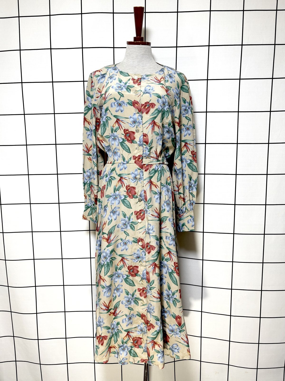 花柄 前開き ノーカラー ウエストゴム レトロ USA古着 ヴィンテージワンピース