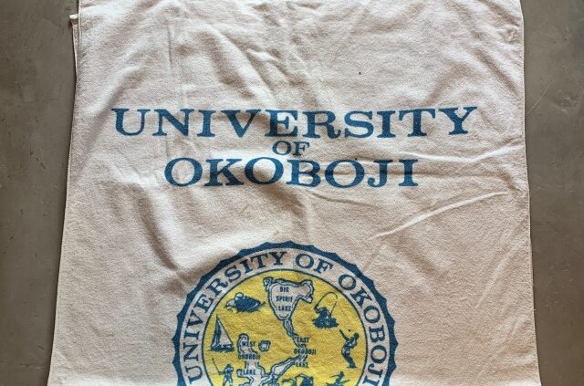 【163cm×92cm】USA製 OKOBOJI オコボジ大学 バスタオル 白■ビンテージ アンティーク レトロ カレッジプリント ブランケット ラグ