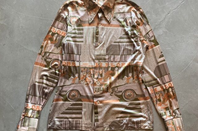 【S/M】ボロ 70s CAFE DE ELORE 長袖ポリエステルシャツ ピクチャー柄 総柄■ビンテージ オールド レトロ アメリカ古着 ポリシャツ アート