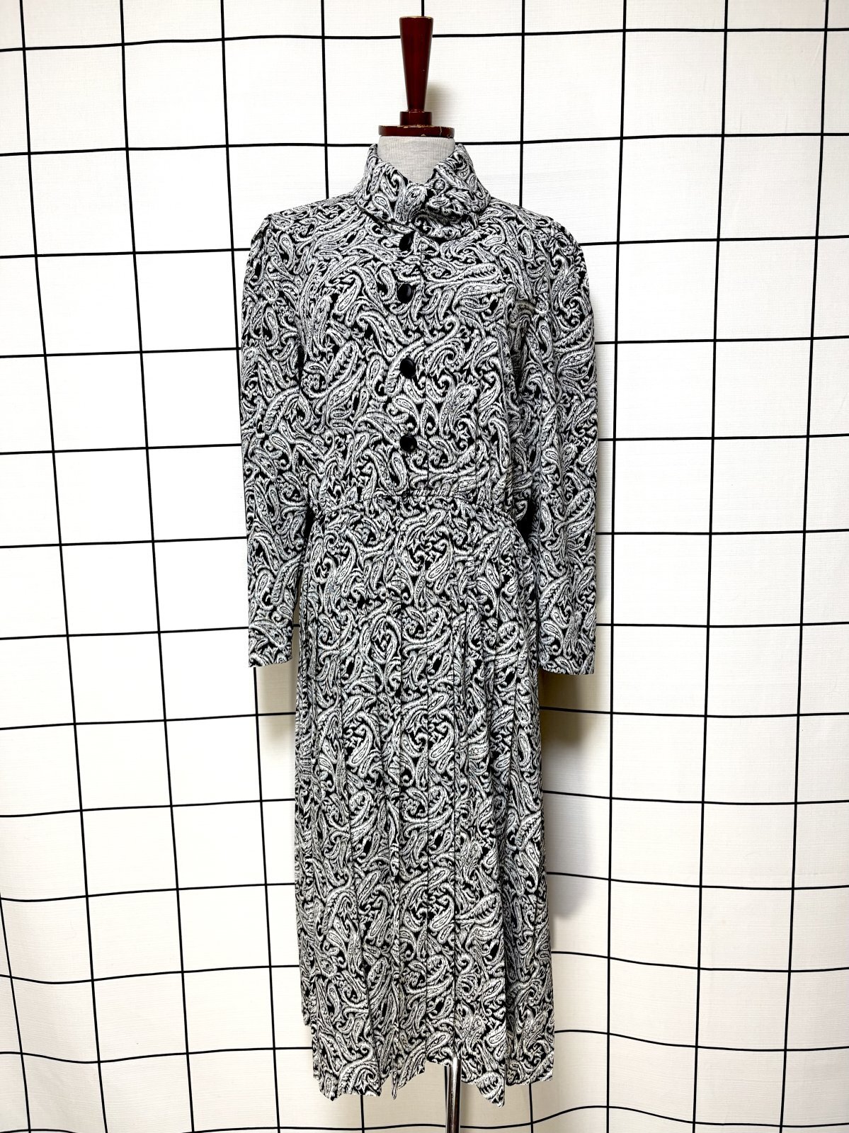 プリーツ切り替え ペイズリー モノクロ ウエストゴム レトロ USA古着 ヴィンテージワンピース