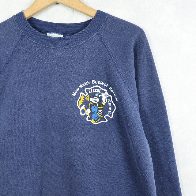 80’s USA製 “RESCUE 4 F.D.N.Y” キャラクタープリントラグランスウェット NAVY XL