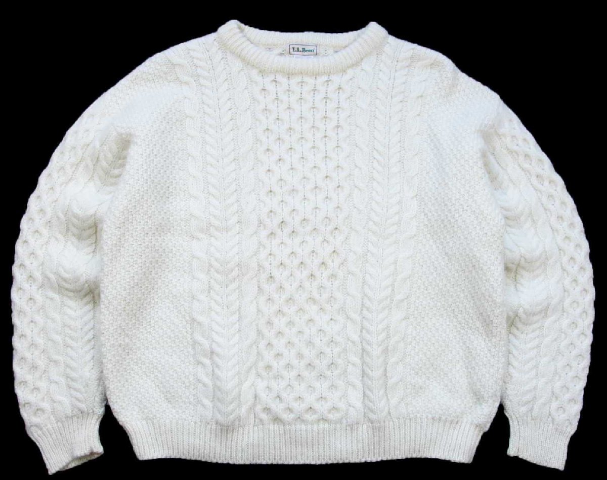 90s アイルランド製 L.L.Bean ケーブル編み ウールニット セーター ナチュラル XL★フィッシャーマン