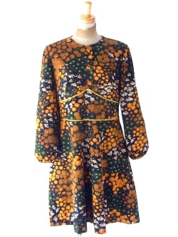 LITTLE BIRD【送料無料】フランス買い付け 70年代製 オレンジ X ブラック 花柄 ドレープ襟 ヴィンテージ ワンピース 25FC109【ヨーロッパ古着】