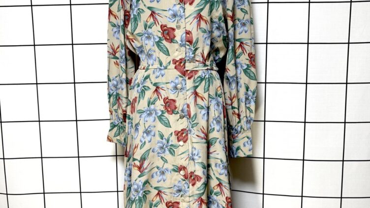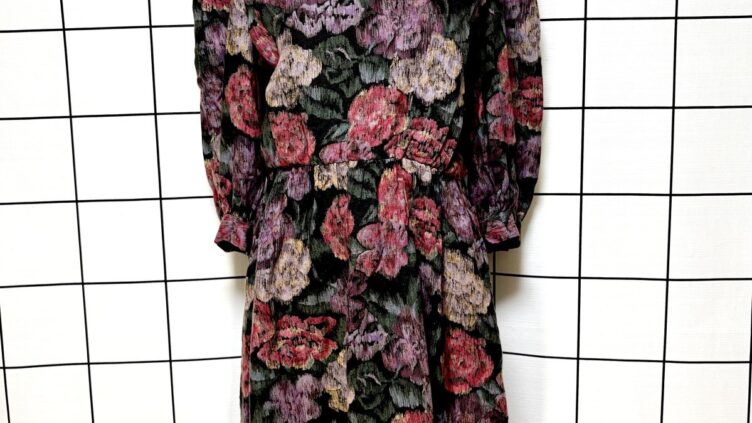 古着屋チエルアルコ花柄 ウエストゴム レトロ 長袖 USA古着 ヴィンテージワンピース