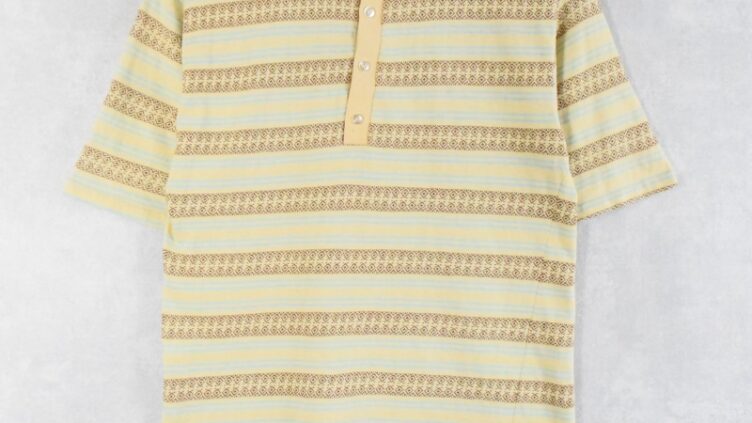 60〜70’s Career Club USA製 ジャガードボーダー柄 ヘンリーネックTシャツ L