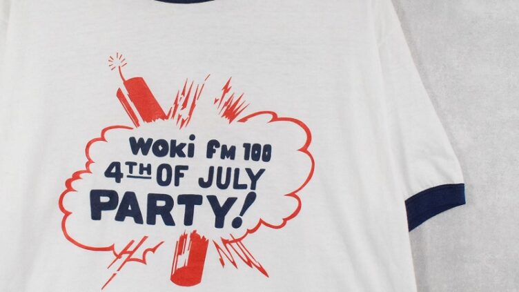 80〜90’s WOKI FM100 USA製 ラジオ局プリントリンガーTシャツ XL