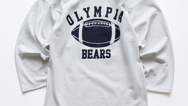 80’s RUSSELL W-PRINT CROPPED SLEEVE V NECK FOOTBALL TEE “OLYMPIA BEARS” “MADE IN USA”