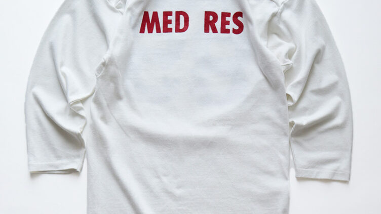 〜80’s RUSSELL W-PRINT CROPPED SLEEVE V NECK FOOTBALL TEE “MED RES” “MADE IN USA”