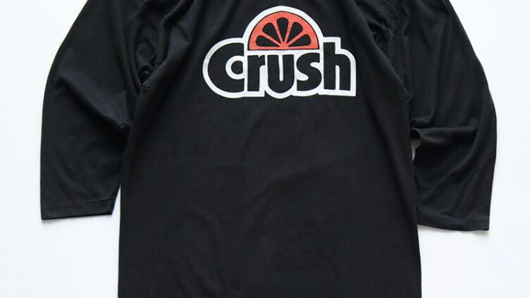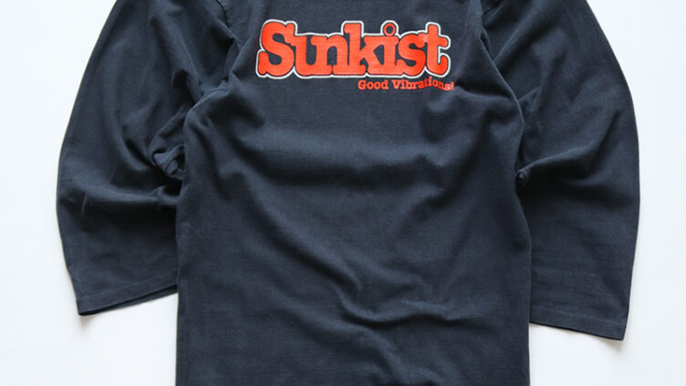 70’s-80’s sportswear BLACK COTTON PRINT CROPPED SLEEVE FOOTBALL TEE “Sunkist” “MADE IN USA”