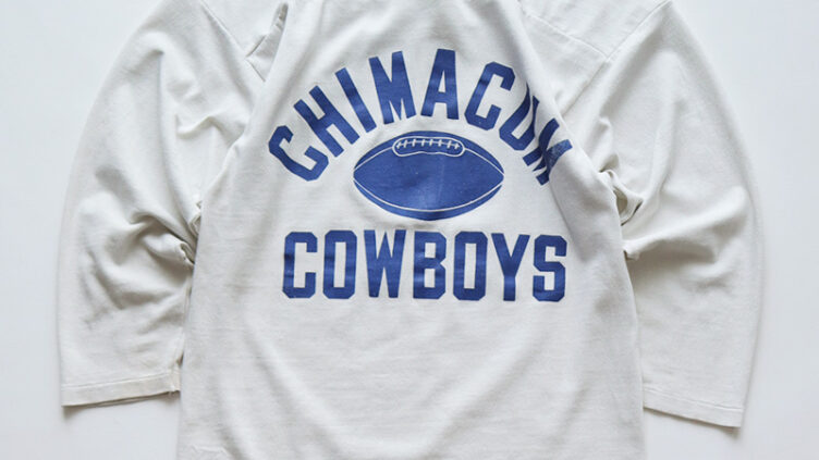 〜80’s UNKNOWN BRAND W-PRINT CROPPED SLEEVE V NECK FOOTBALL TEE “CHIMACUM COWBOYS”