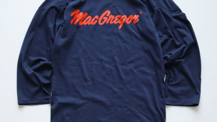 〜80’s MEDALLION PRINT CROPPED SLEEVE V NECK FOOTBALL TEE “MacGregor” “MADE IN USA”