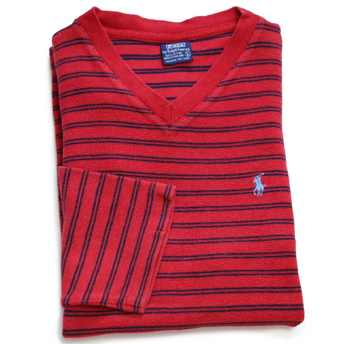 90s ポロ ラルフローレン ボーダー Vネック コットン カットソー 赤×紺 ボーイズL