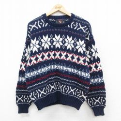 M★古着 長袖 ノルディック セーター メンズ 80年代 80s 雪柄 フェアアイル コットン クルーネック USA製 紺他 ネイビー 【spe】 25oct30 中古 ニット トップス