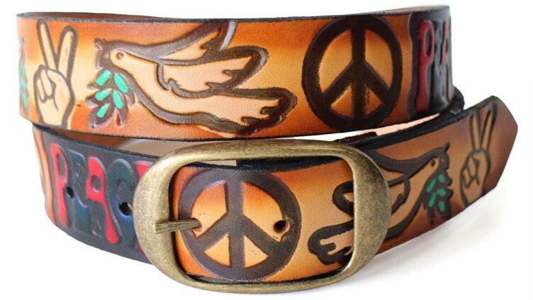 Sixpacjoe新品★USA製 BRACKNEY LEATHER WORKS PEACE ピースマーク 型押し ペイント レザーベルト ブラウン 34