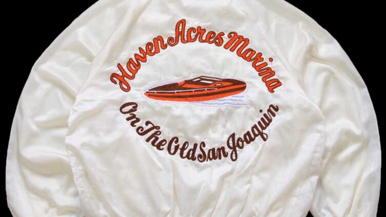 Sixpacjoe90s USA製 Haven Acres Marina On The Old San Joaquin ボート チェーン刺繍 サテンジャケット アイボリー L
