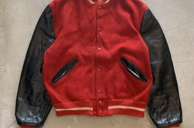 JACK CLOTHING SUPPLY【L】70s-80s USA製 DeLong 袖革×ウールスタジャン ジャケット 赤黒■ビンテージ オールド アメリカ古着 アワード 無地
