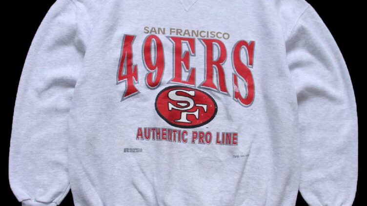 Sixpacjoe90s USA製 RUSSELLラッセル NFL SAN FRANCISCO 49ERS ペンキ飛び 前V スウェット 杢ライトグレー XL