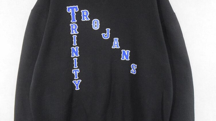 Feeet90’s RUSSELL ATHLETIC USA製 “TRINITY TROJANS” 前V フットボールチーム プリントスウェット BLACK XL