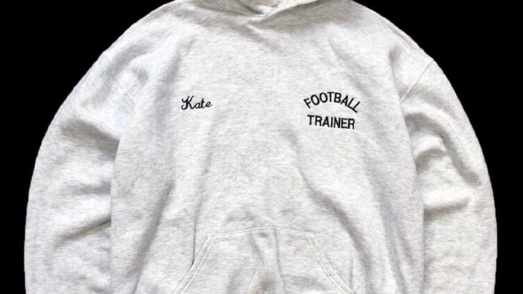 Sixpacjoe90s USA製 RUSSELLラッセル FOOTBALL TRAINER Kate 刺繍 スウェットパーカー 杢ライトグレー XL★フーディー