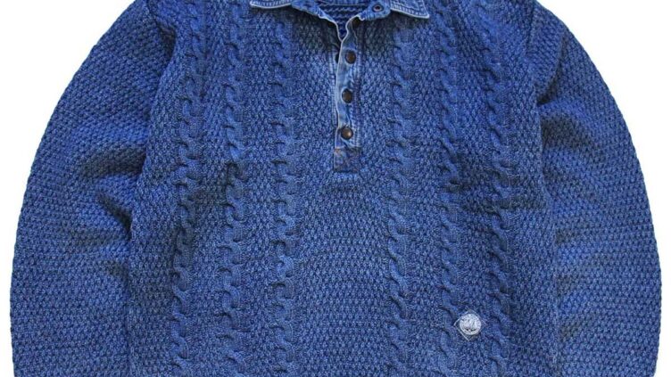Sixpacjoe90s デンマーク製 BLUE WILLI’S デニム切り替え 襟付き ケーブル編み コットンニット セーター インディゴ M
