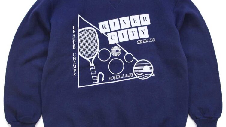 Sixpacjoe90s USA製 RUSSELLラッセル RACQUETBALL LEAGUE ラケット ひび割れプリント 前V スウェット 紺 L