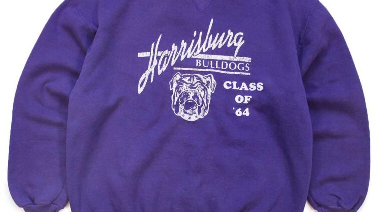 Sixpacjoe90s USA製 RUSSELLラッセル Harrisburg BULLDOGS ブルドッグ ひび割れ&フェルトプリント 前V スウェット 紫 XL
