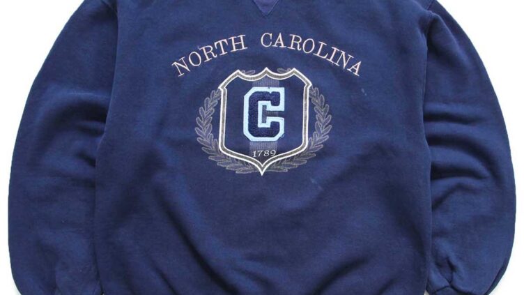 Sixpacjoe90s USA製 RUSSELLラッセル NORTH CAROLINA レタードパッチ&刺繍&ひび割れプリント 前V スウェット 紺 L