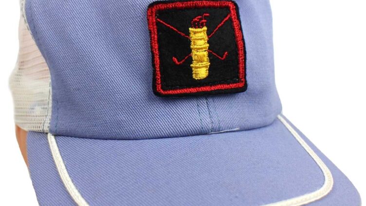 Sixpacjoeデッドストック★80s USA製 ゴルフ クラブ パッチ付き ライン入り ツートン 切り替え メッシュキャップ ライトブルー×白
