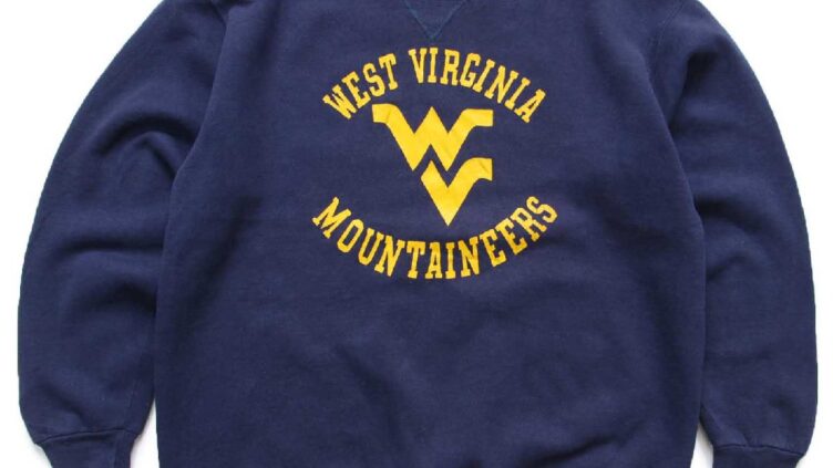 Sixpacjoe90s USA製 RUSSELLラッセル WEST VIRGINIA MOUNTAINEERS ペンキ飛び 前V スウェット 紺 L