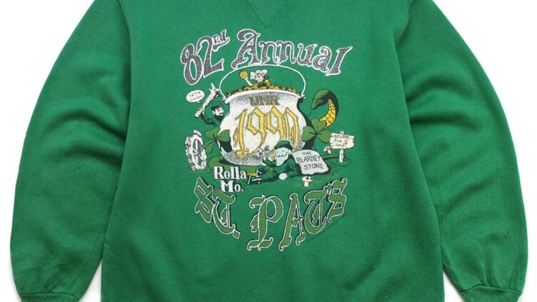 Sixpacjoe90s USA製 RUSSELLラッセル 82nd Annual ST.PAT’S UMR 1990 ひび割れプリント 前V スウェット 緑 L