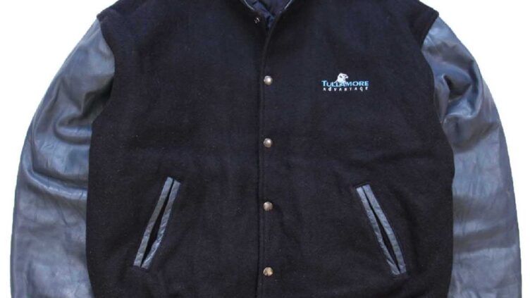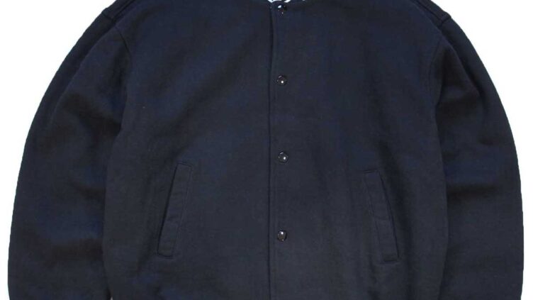 Sixpacjoe90s カナダ製 jjm TULLAMORE ADVANTAGE 刺繍 スタンドカラー キルティングライナー メルトン ウール 袖革スタジャン 黒×紺