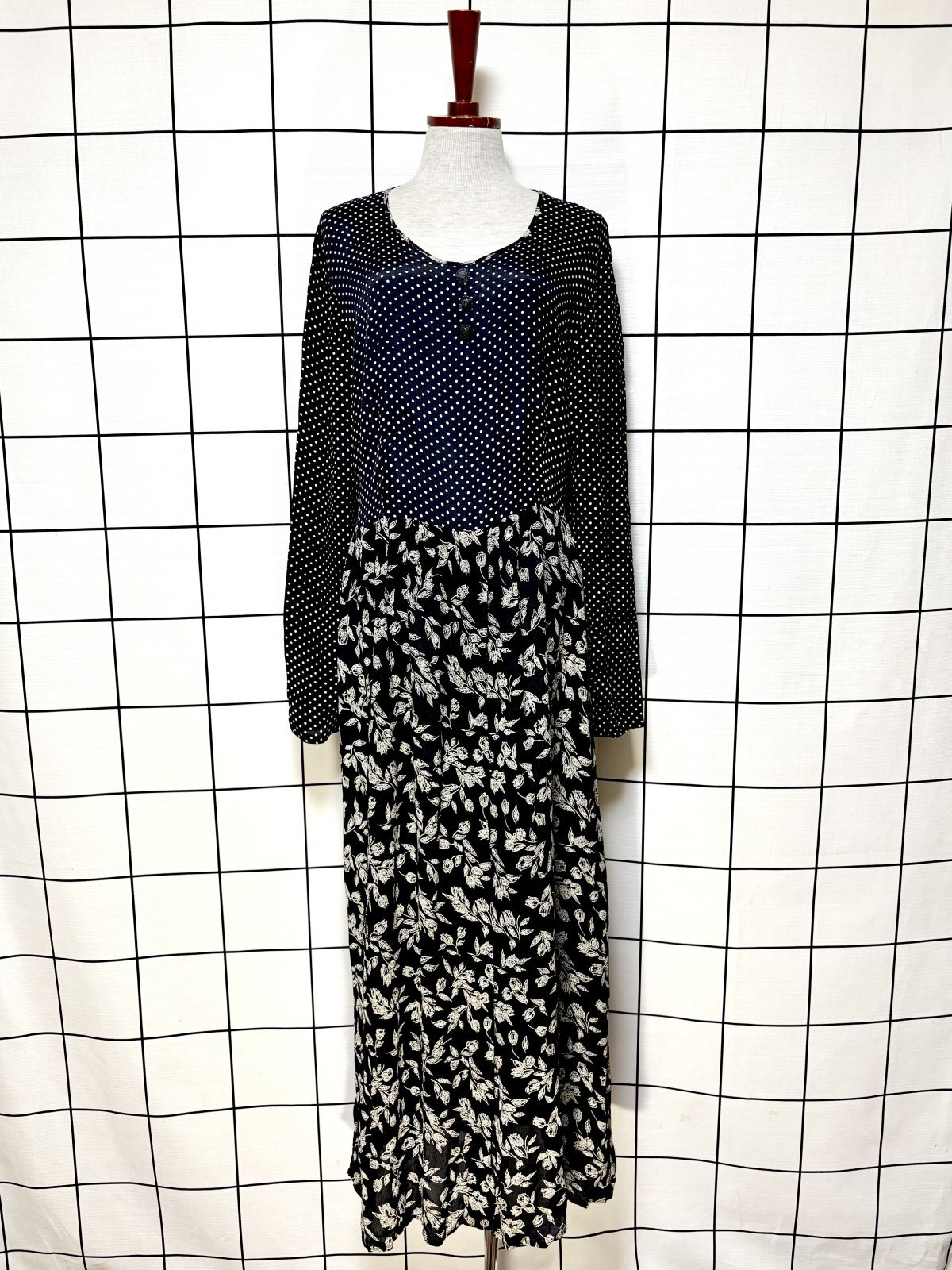 ドット柄 リーフ柄切り替えし バックリボン ブラック レトロ USA古着 ヴィンテージワンピース